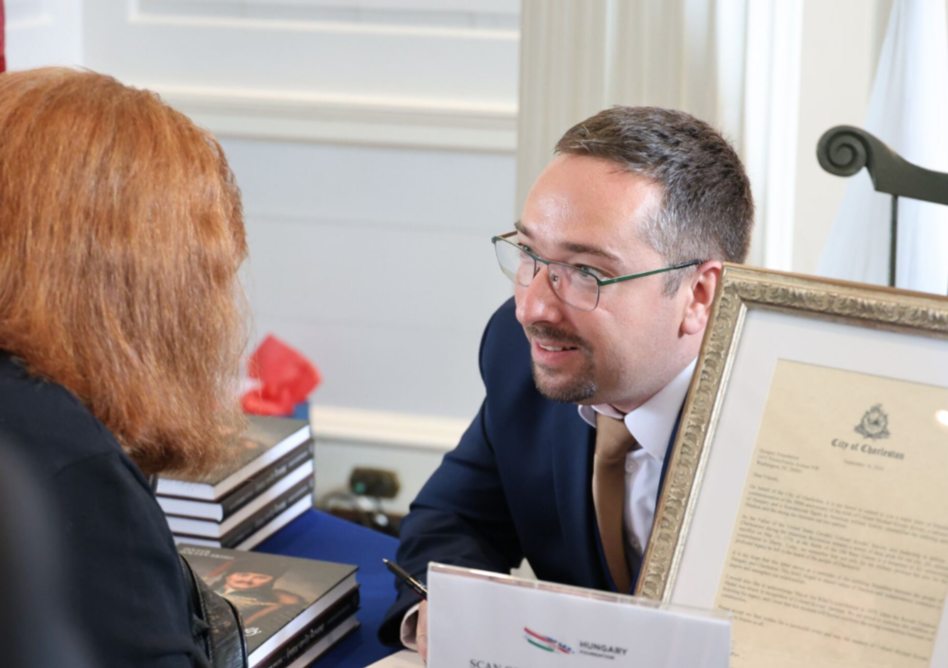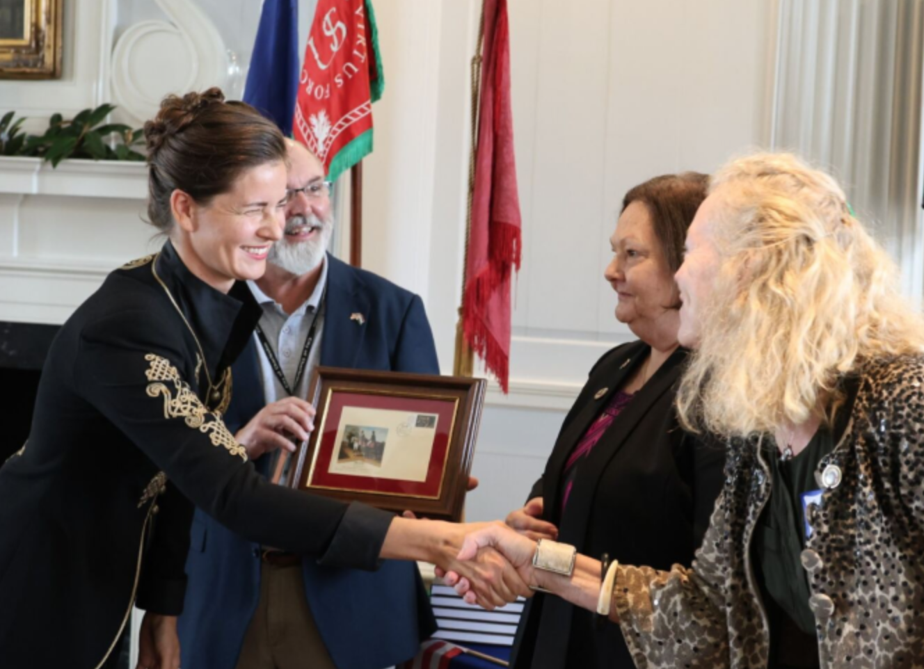At the event, the Hungary Foundation and the Mihály Kovats Friendship Society presented the Old Exchange with a newly commissioned Pulaski banner, sewn in Debrecen, Hungary and a commemorative stamp issued by the Hungarian Postal Service inspired by Mihály Kovats, which will be on display at one of the most visited Revolutionary War landmarks in the South.