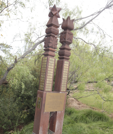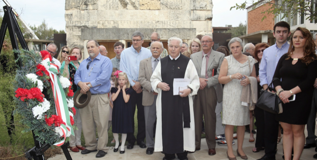 After the church service, wreaths were laid at the 1956-ers Kopjafa Monument. This monument was carved by artisans in Transylvania, brought over to Texas by four families (in suitcases on airplanes) and erected in front of the abbey for the 50th anniversary of the revolution by the late Gazda Imre, and his family and friends. A short tribute was read by Márton Béla, also a 56-er, and one of the four who brought the pieces of the memorial here. This part of the commemoration was concluded with the singing of the Hungarian National Anthem.