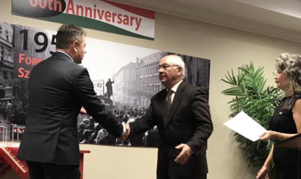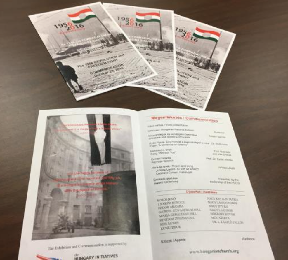 October 23, 2016 was very special day for more than a hundred Hungarians living in the state of Georgia. Prior to the commemorative ceremony, people representing every generation stopped by a nicely arranged exhibition and looked at the photos of dramatic scenes, old newspapers and other symbolic items about the 1956 Revolution and Freedom Fight. Parents excitedly showed the very familiar streets and buildings of Budapest to their children and grandchildren, and talked about what happened during those days and where the events occurred in the city. Some of the 56ers shared their personal stories and involvement in the freedom fight, which were also captured in a book published a few years earlier.