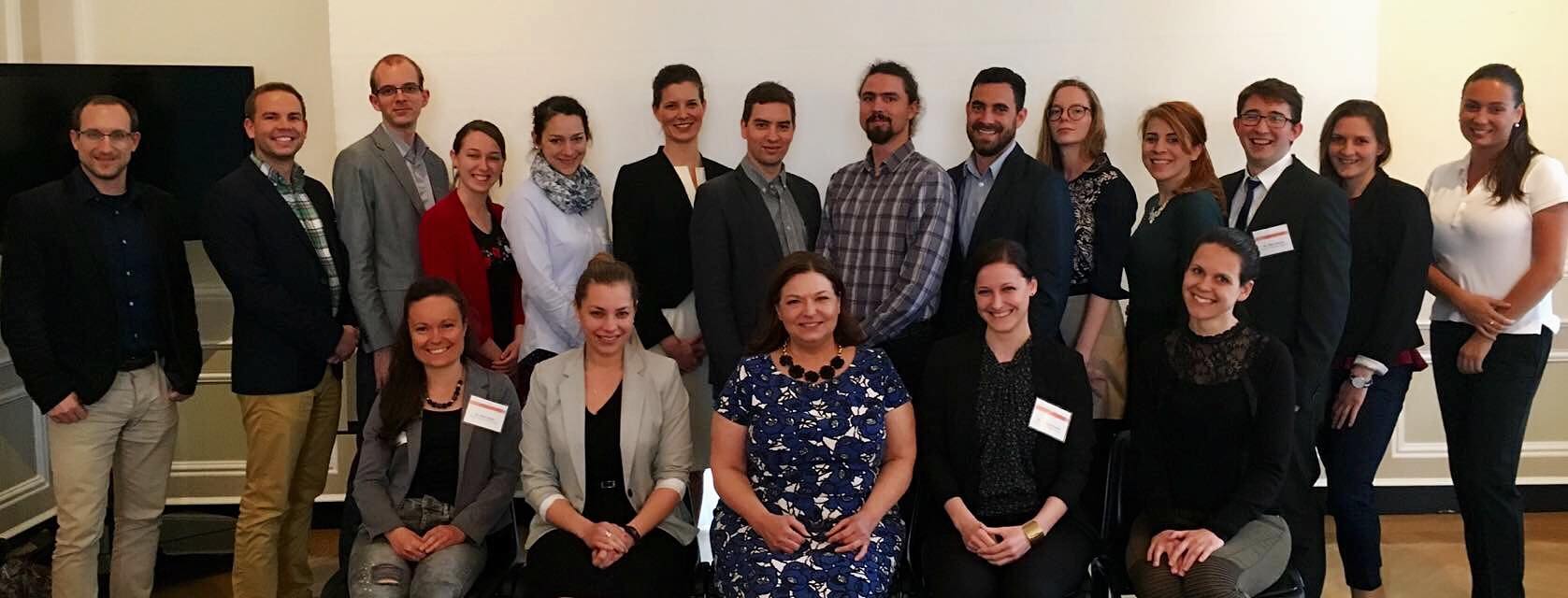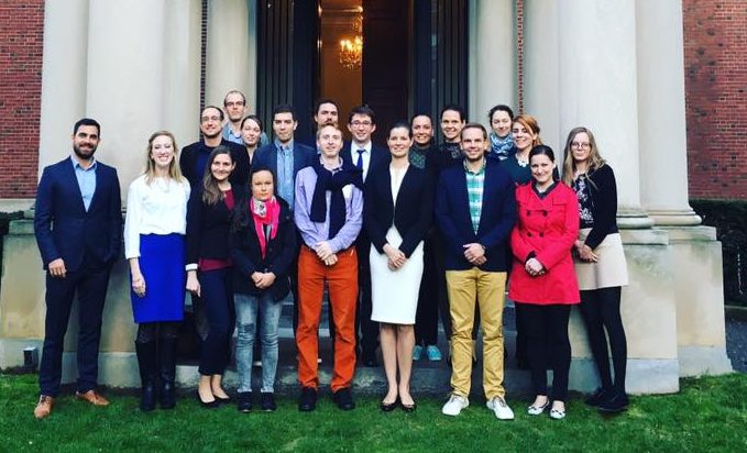 The inaugural class of YHLP 2017: Csilla Ábárn, Adorján Benkő, László Dinca, Vivienn Érsek, Györgyi Facskó, Csenge Gonda, Ádám Gyöngy, Márton György, Anikó Ivanics, Rita Jakab, Máté Mátyás, Gergő Mojzes, Krisztina Pethő, Viktor Pólya, Noémi Szabó, Gergely Szilvay, Mikolt Tózsa, and Eszter Völner with HIF Executive Director Anna Smith Lacey and Kirsi Jarvis of the Meridian Center