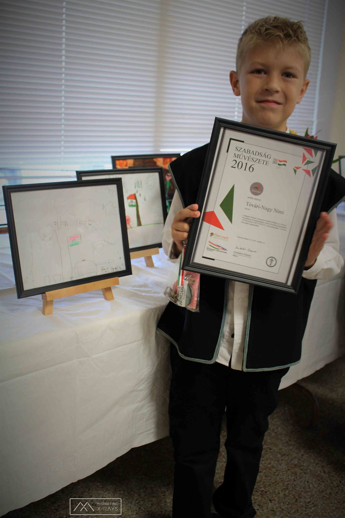 Guests, many dressed in traditional Hungarian attire, then enjoyed a reception in the church fellowship hall, festively decorated for the occasion. Janos Noszek sang  Hungarian songs while accompanying himself on the keyboard. Tulipanok, the costumed children’s folk dance troupe, entertained; and their teacher, Istvan Csapai, performed a special dance for the guests. Pieces of art created by the youngsters for the contest attracted a great deal of interest. The video and pictures taken during the project were previewed during the evening.