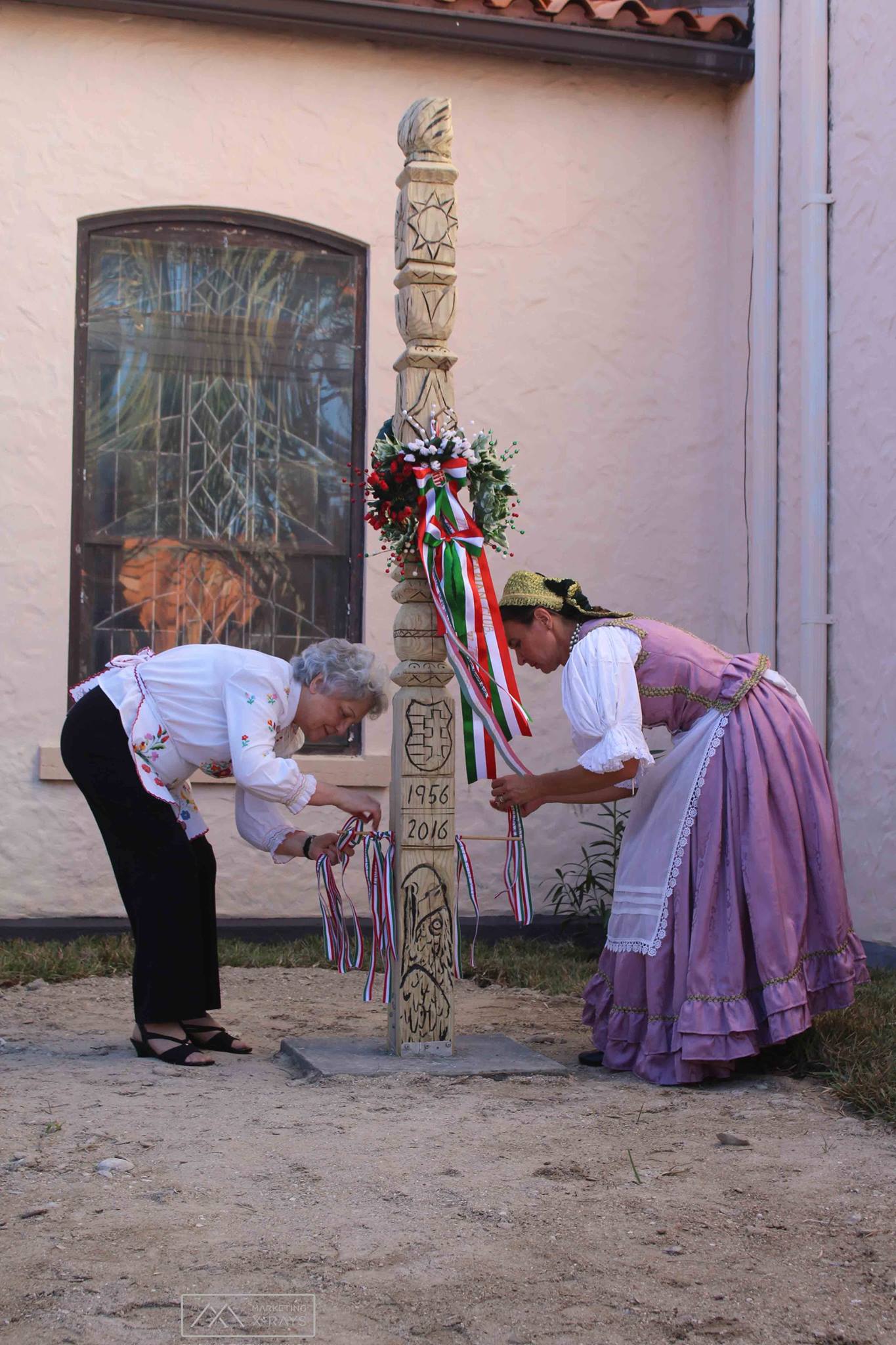 The commemoration, held on October 23 began with Hungarian Community Church Pastor Emese Asztalos leading a worship service in the sanctuary assisted by Pastor Bill Anderson of First Presbyterian and Csilla Csagoly providing music and Jolan Toth‘s  poetry recital. The congregants were then led into the church courtyard where the “Szabadsag Kopjafa” (Freedom Monument) was unveiled. The surface of the handsome eight-foot upright piece of wood had a number of Hungarian symbols carved into it, including the years 1956 – 2016, Hungary’s Coat of Arms and mythical falcon, six bars for the 60th, tulip, the sun, eternal flame, water, earth, star.