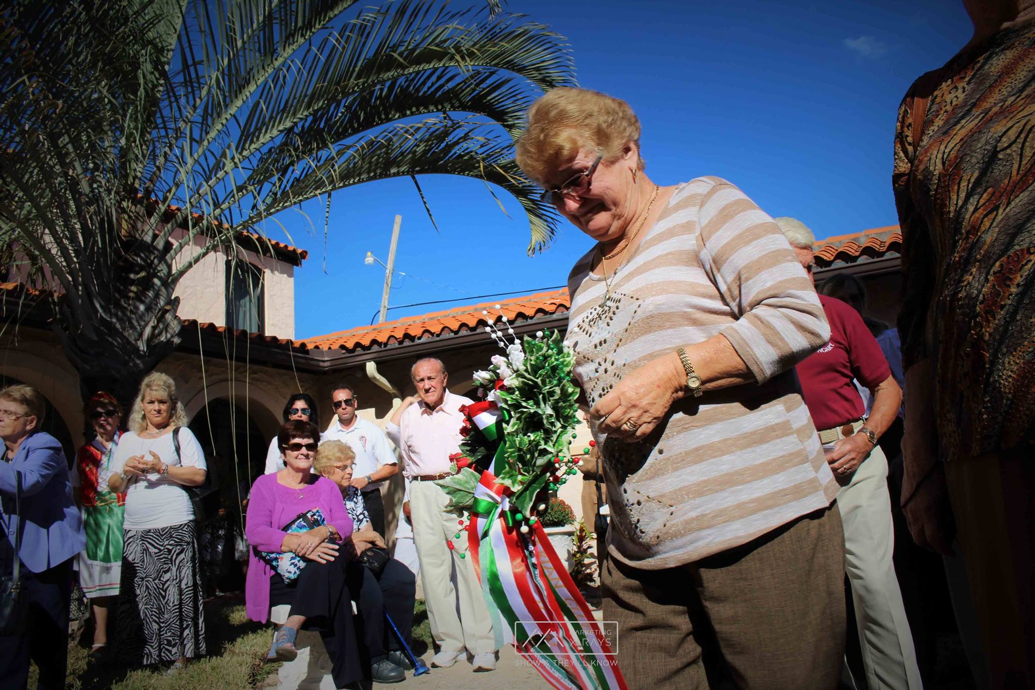 As part of the ceremony, memorial wreaths – one from the Hungarian/American Social Club and one from the Hungarian church – were hung on the kopjafa as were many red, white and green ribbons with names of those being memorialized/honored by a loved one. A plaque is also being made and will be placed in the concrete base that holds the piece of art. Pre-school students from Makviragok, Orlando, led the group in singing the Hungarian National Anthem and Ana Balogh recited a poem.