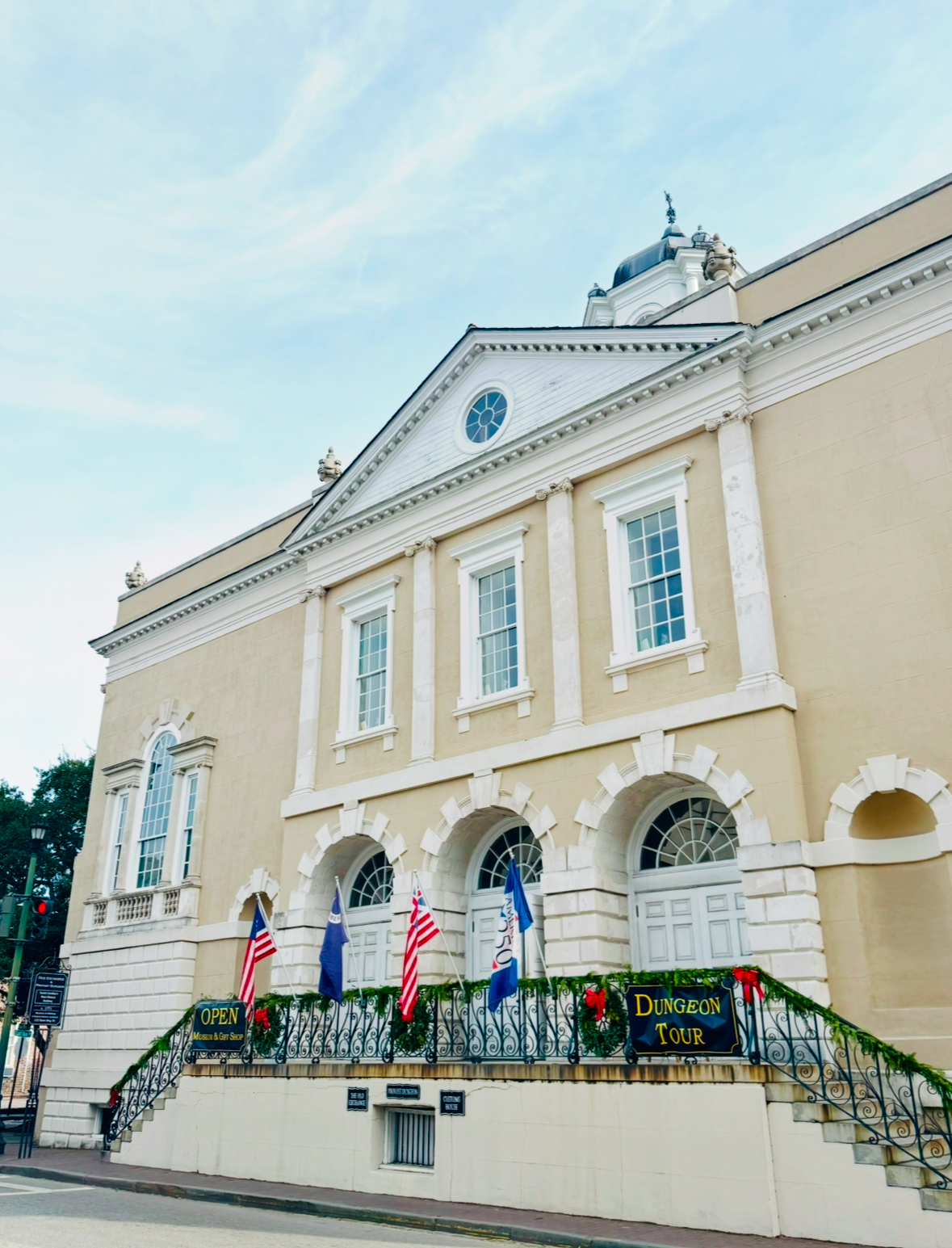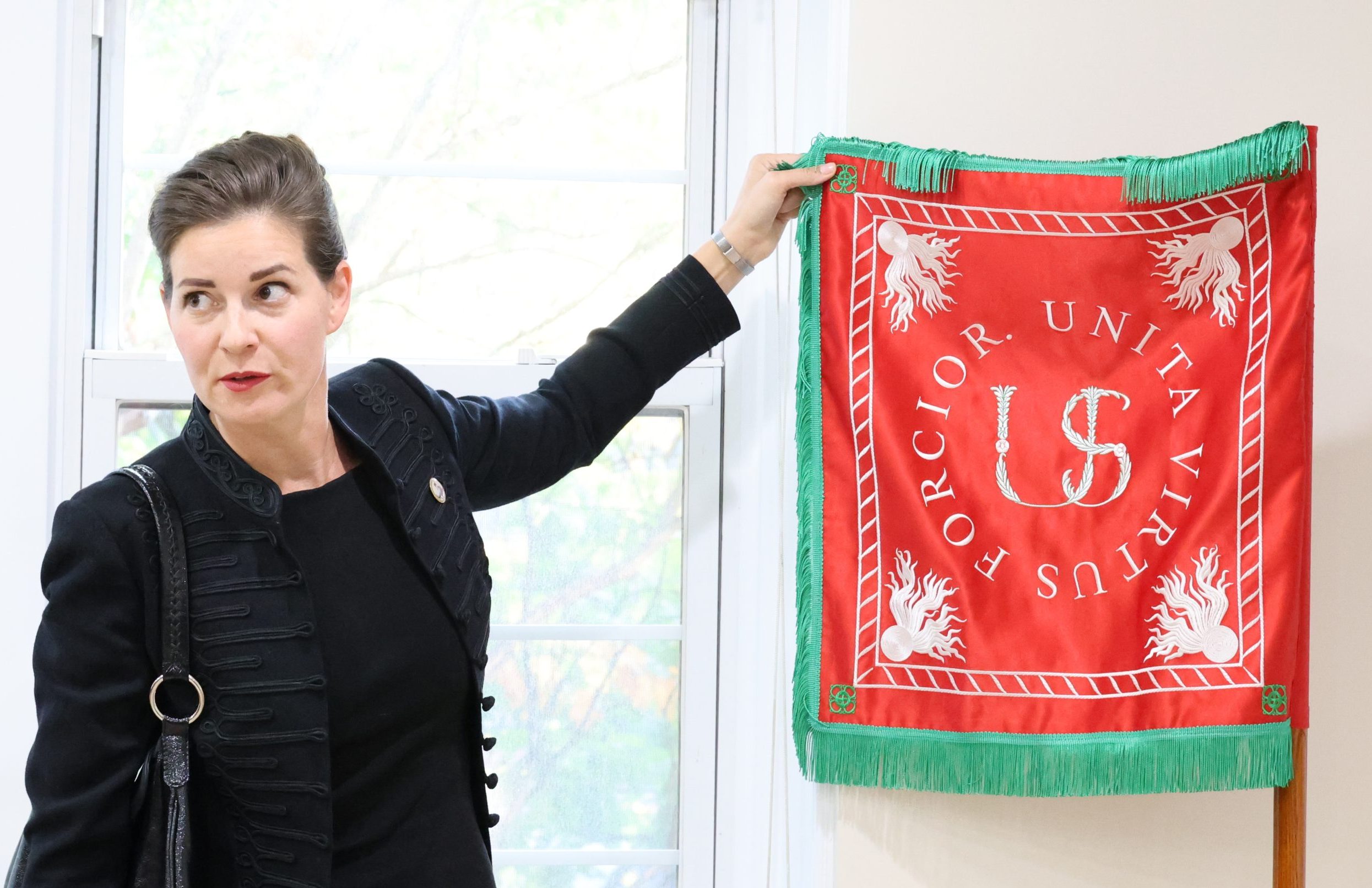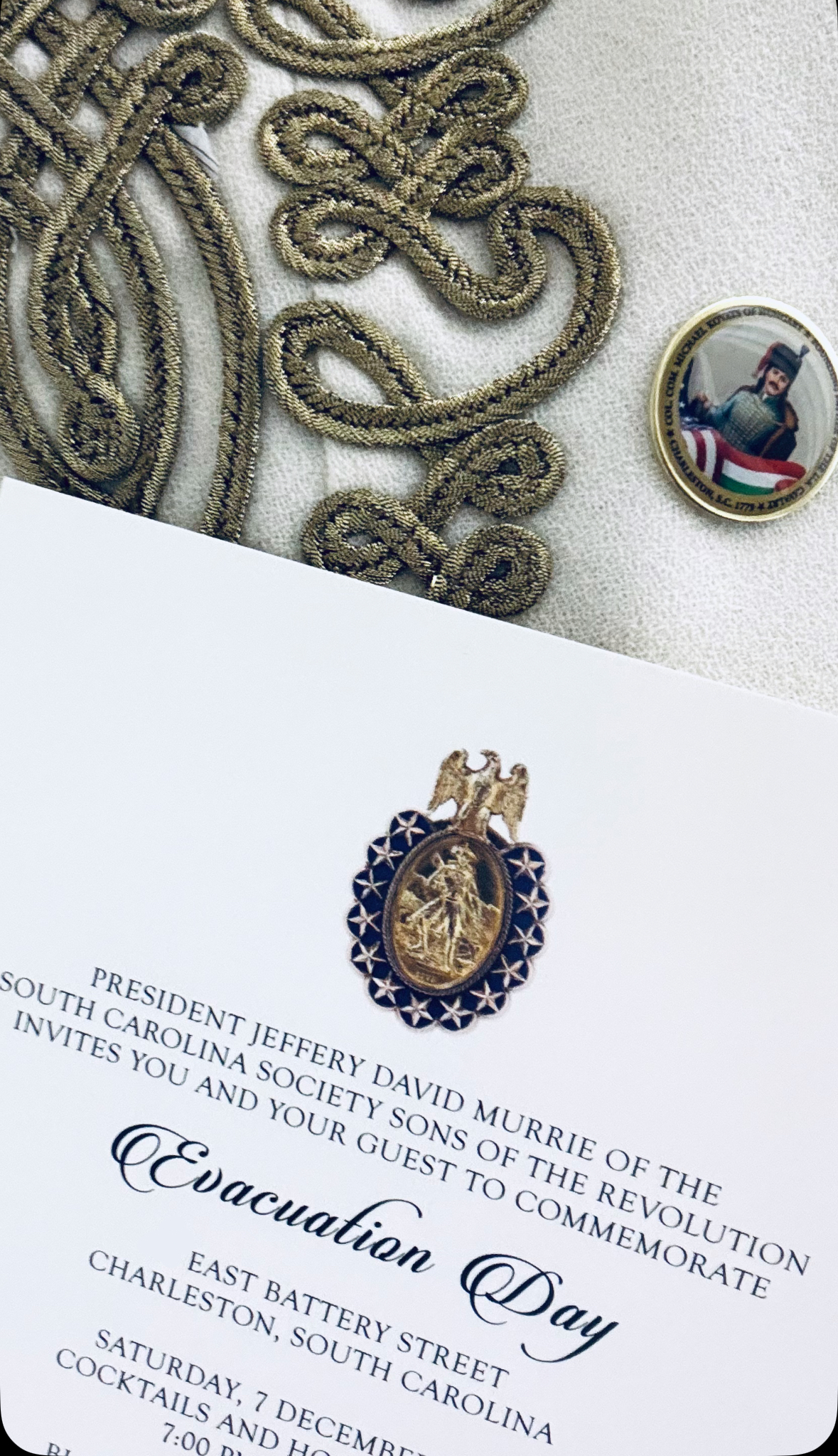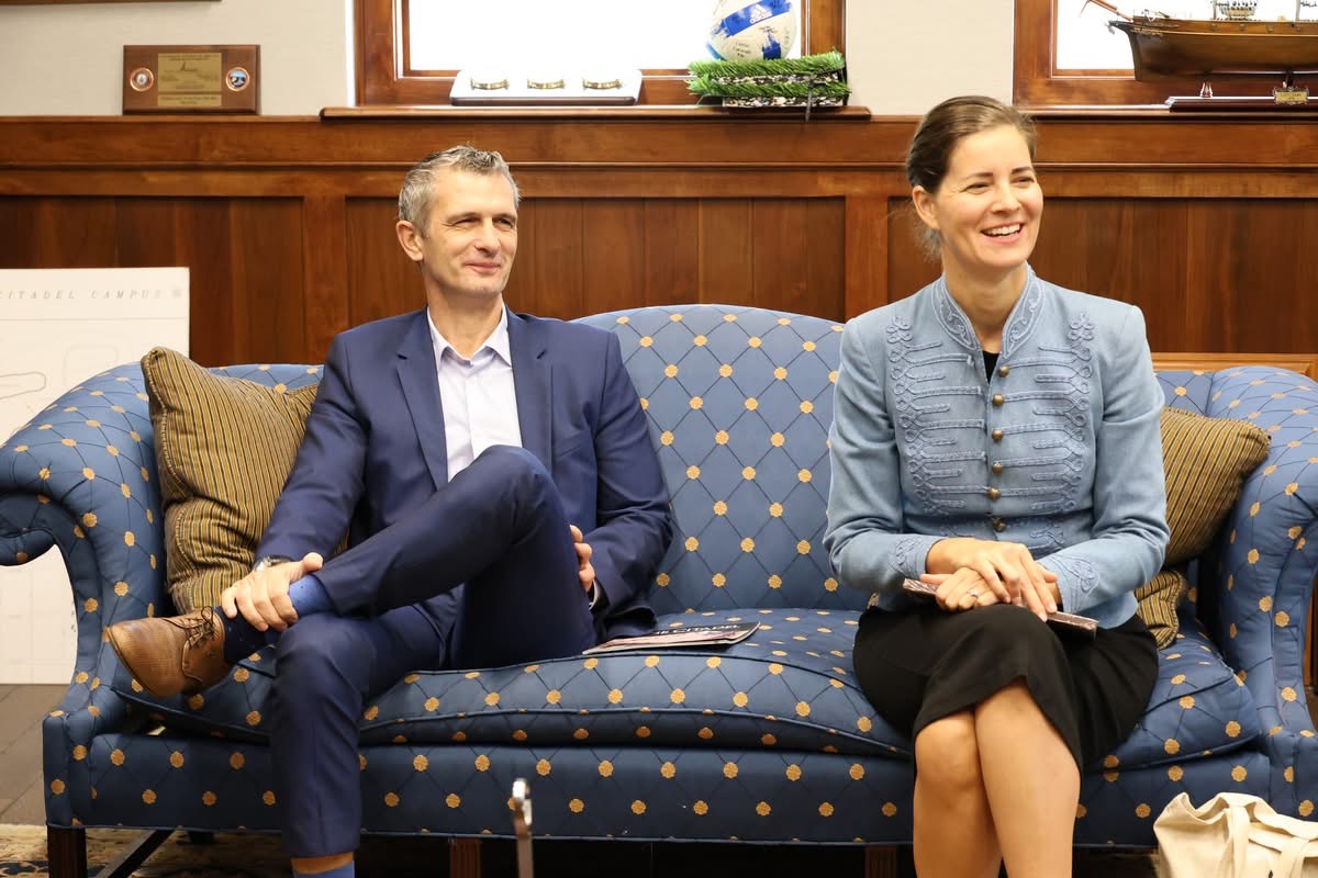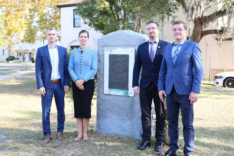 On October 27, Charleston became the site of the tour’s most spelndid event, held at The Old Exchange & Provost Dungeon Museum. Prominent historical societies, including The Society of the Cincinnati, the Washington Light Infantry, South Carolina 250, Charleston 250, and the Daughters of the American Revolution made the event a beautiful and inclusive celebration. The program revisited Kováts’ role in Charleston’s history and celebrated ongoing efforts to locate his burial site, to honor him as a respected adversary of the British. The Michael Kováts Memorial Committee presented a period-accurate Pulaski-Kováts battle flag and the Hungarian Postal Service’s commemorative stamp to the Charleston hosts. The Committee also visited The Citadel military academy, where they engaged in discussions with Citadel President General Glenn M. Walters and observed the Kovats Field and memorial created by Sándor Finta. At the SC Sons of the American Revolution’s annual Evacuation Day event, Anna Smith Lacey joined distinguished members of the society and talked about the memorial year’s initiatives and ideas to preserve and promote Kováts’ legacy in the future.