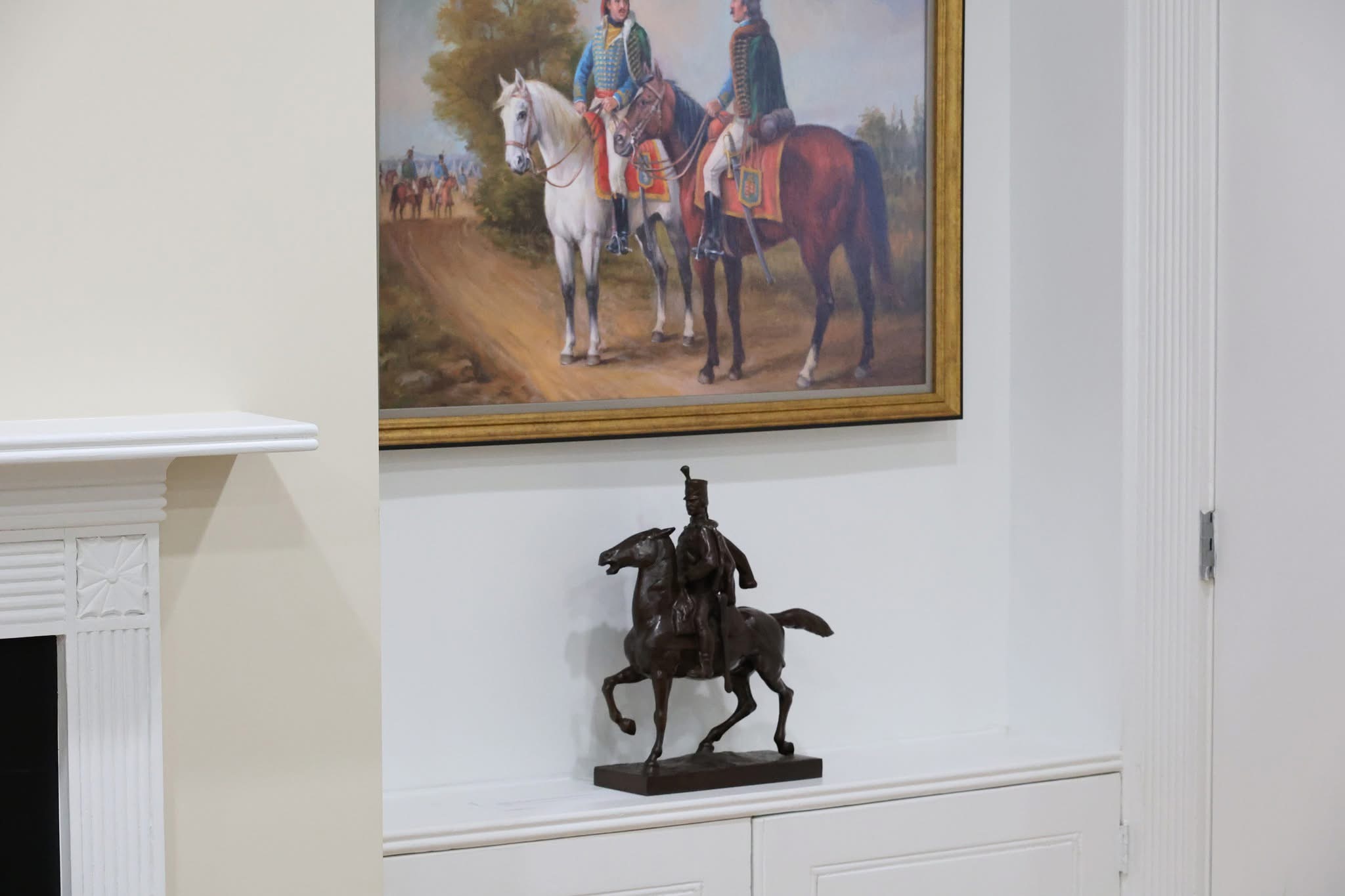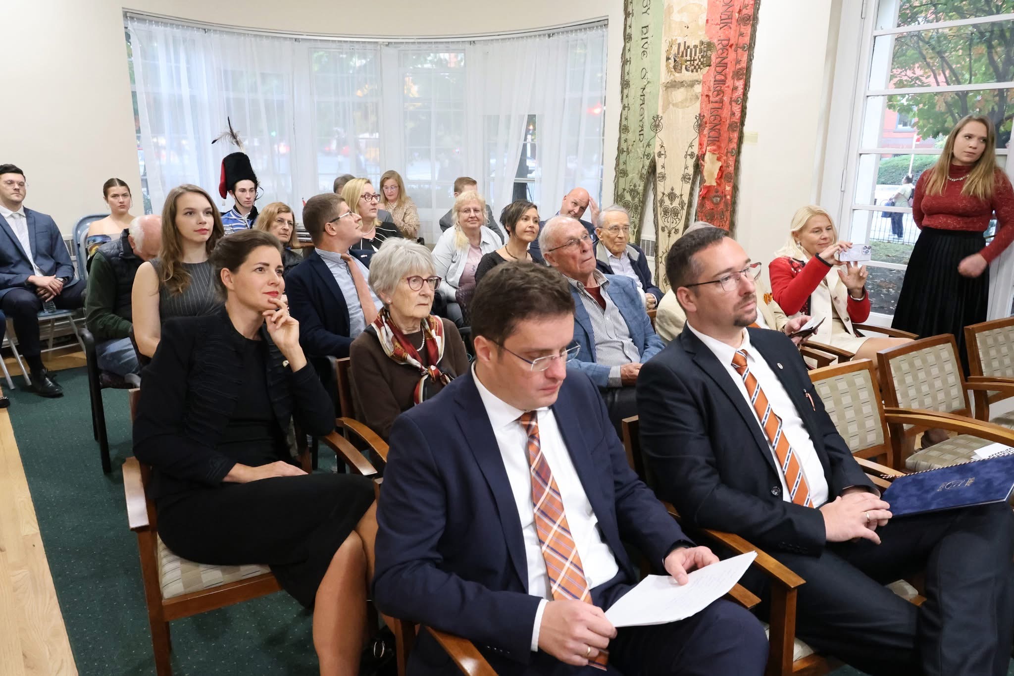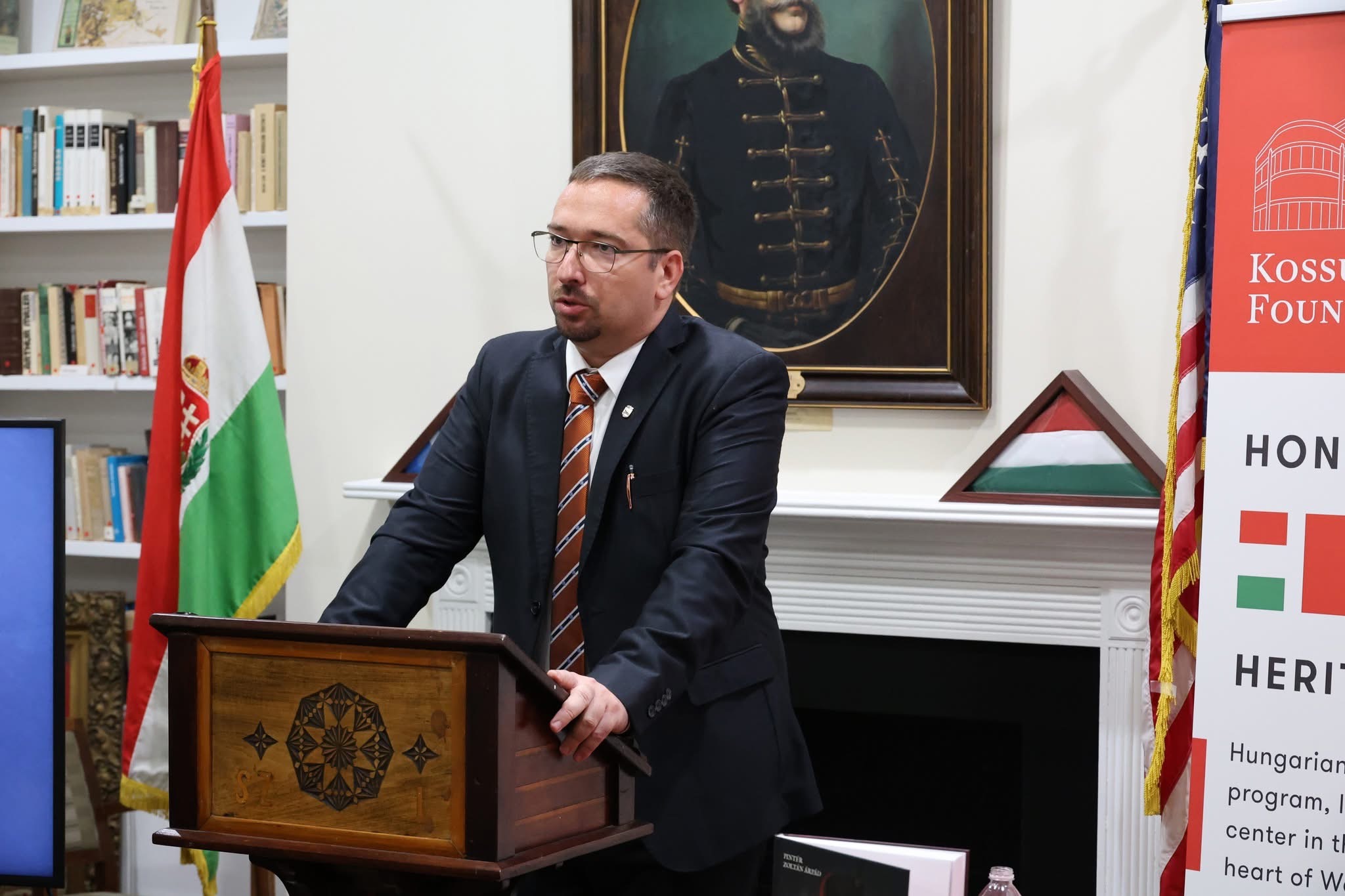The journey began on October 25, 2024, at the Kossuth House in downtown Washington, D.C., where Hungarian and American dignitaries gathered to honor Colonel Kováts. At the event organized by the Kossuth Foundation, a bronze relief by renowned sculptor Sándor Györfi was unveiled, taking its place between portraits of Lajos Kossuth and President Theodore Roosevelt. The relief’s blessing by the pastor of the local Hungarian community and wreath-laying by Hungarian officials, diaspora leaders, and members of the Michael Kováts Memorial Committee underscored the significance of this new addition to Washington’s Hungarian-American landmarks. An 18-year-old local Hungarian donned a Nádor hussar uniform, brought over from Hungary for the event series, symbolized the living legacy of hussars in military history. The event also included the DC book launch of Dr Zoltán Pintér’s bilingual biographical book on Kováts, the renaming of a library space featuring works by Aurél Raskó and Sándor Bodó to Michael Kováts Hall, and a lecture on the Pulaski-Kováts flag, an authentic replica of which was presented to the Kossuth House. A highlight of the event was the temporary exhibition of Sándor Finta’s equestrian statue of Kováts, loaned by The Society of the Cincinnati. The statue, not publicly displayed for decades, captured the imagination of all attendees.